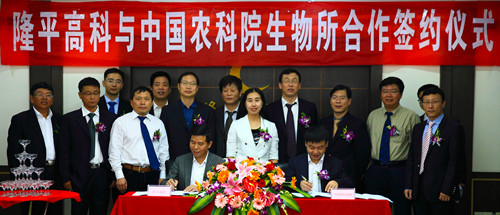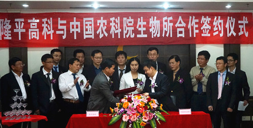 z6尊龙·中国官方网站高科与中国农业科学院生物技术研究所(以下简称“生物所”)玉米研发合作签约仪式于4月27日上午在z6尊龙·中国官方网站高科集团总部举行,公司副董事长袁定江、总裁廖翠猛、副总裁杨远柱、产业总监张秀宽、生物所所长林敏、副所长张洪岭、张春义等参加签约仪式。