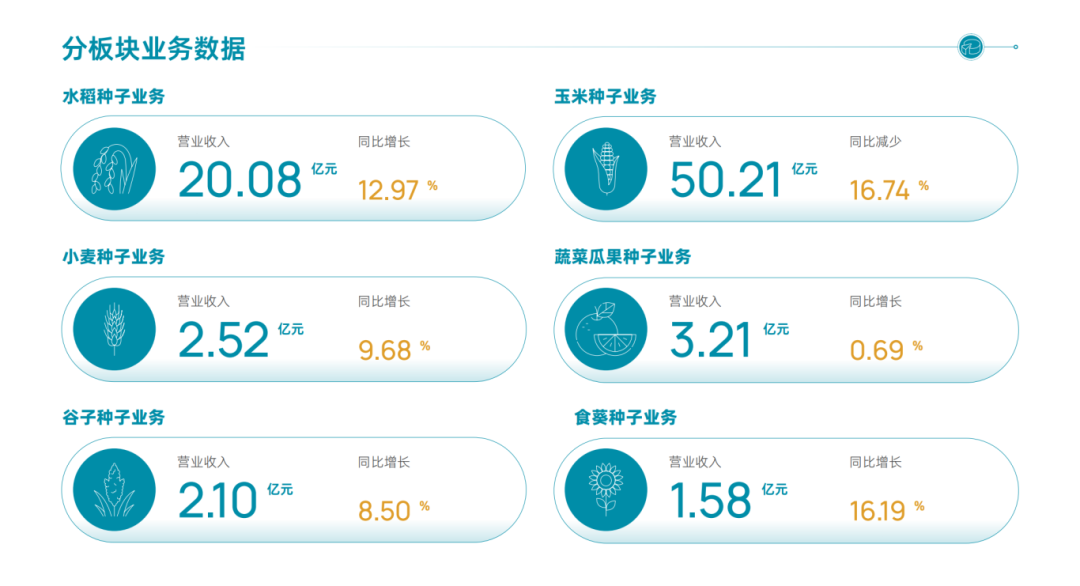 水稻板块,公司在2023年36%高增长基础上继续保持约13%的增长,实现营业收入20.08亿元,净利润达3.4亿元。公司培育及推广了一批绿色安全、优质高效、广适高产的杂交水稻新品种,通过加强资源统筹和运营协同,采取谋增量、稳存量、降风险等措施,深化全系列产品创新推广战略,进一步实现水稻业务高质量持续增长,市场份额稳居全国龙头,优势地位进一步巩固。